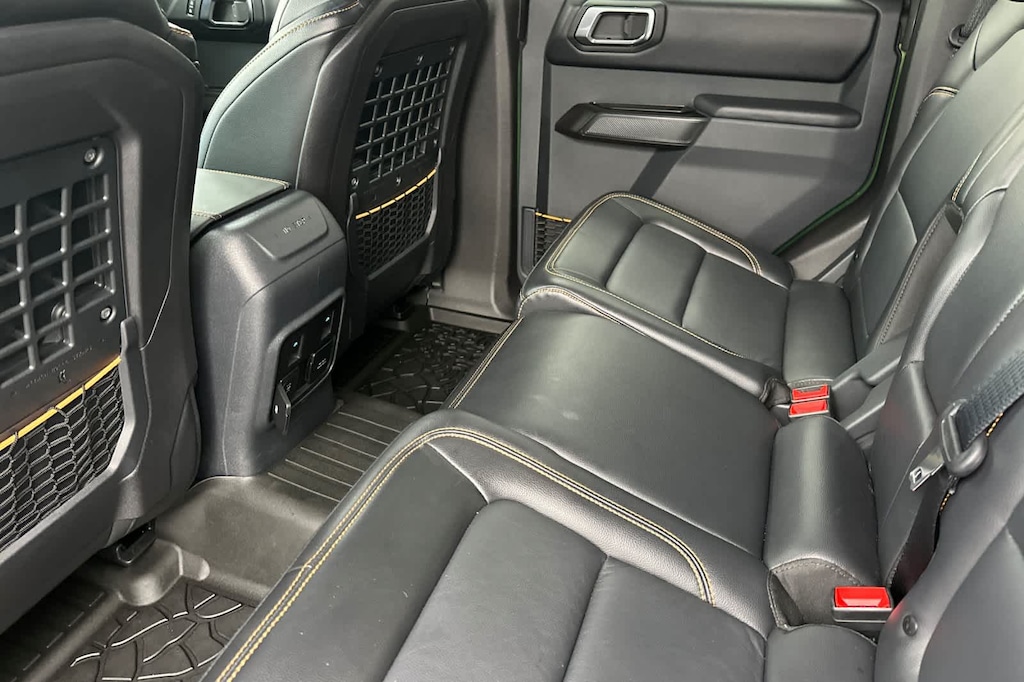 EQUIPMENT GROUP 334A HIGH/LUX PACKAGE Rear Parking Sensors, Power Outlet - Back Side of Center Floor Console, Auto-Dimming Interior Rearview Mirror, Dr & Pass Illuminated Sliding Visor Vanity Mirrors, Evasive Steering Assist, Heated Steering Wheel, Additional Sound Deadening, Information on Demand Panel, Wireless Charging Pad, Dual-Zone Electronic Automatic Temperature Control, air conditioning, Ford Co-Pilot360, Enables compatibility w/FordPass performance app w/off-road navigation, Auto High-Beam Headlamps, Pre-Collision Assist w/Automatic Emergency Braking, pedestrian detection, forward collision warning and dynamic brake support, Blind Spot Information System (BLIS), Cross-Traffic Alert, Rear View Camera, backup assist grid lines, Lane-Keeping System, Lane-Keeping Alert, Lane-Keeping, SASQUATCH PACKAGE W/NON BEADLOCK CAPABLE WHEELS Advanced 4x4 w/automatic on demand engagement, High Clearance Fender Flares, High Clearance Suspension, Wheels: 17 Carbonized Gray-Painted Alloy, 4.7 Final Drive Ratio, Tires: LT315/70R17 Mud-Terrain, Position-Sensitive Bilstein Shock Absorbers, CARBONIZED GRAY MOLDED-IN-COLOR HARD TOP Rear-Window Defroster & Washer, Hard Top Sound Deadening Headliner, Front Row Top Panels Storage Bag, For on-vehicle storage, ENGINE: 2.7L ECOBOOST V6 electric brake boost, GVWR: 6,180 lbs, TRANSMISSION: 10-SPEED AUTOMATIC trail control, trail turn assist and trail one-pedal driving, 4.46 Axle Ratio. 2024 Ford Bronco with Eruption Green exterior and Black Onyx interior features a V6 Cylinder Engine with 315 HP at 5500 RPM*.