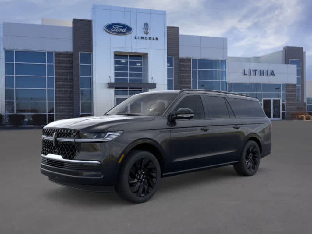 JET APPEARANCE PACKAGE Wheels: 22 High-Gloss Ebony Aluminum, Black Painted Roof Rails, Black Accent Badge, Lincoln Lit Star, Front Bumper Fascia, Unique Lincoln Grille Pillar Black Surround, black mesh insert, Black Beltline Molding, Black Accent Interior Pack, 2ND ROW HEATED & VENTILATED DUAL CAPTAINS CHAIR massage w/power tailored seats and 40/console/40 seat structure (console w/5.8 LCD touchscreen and multimedia audio controls), TRANSMISSION: 10-SPEED AUTOMATIC SelectShift capability (STD). 2025 Lincoln Navigator L with Infinite Black Metallic Clearcoat exterior and Black Onyx interior features a V6 Cylinder Engine with 440 HP at 5400 RPM*.