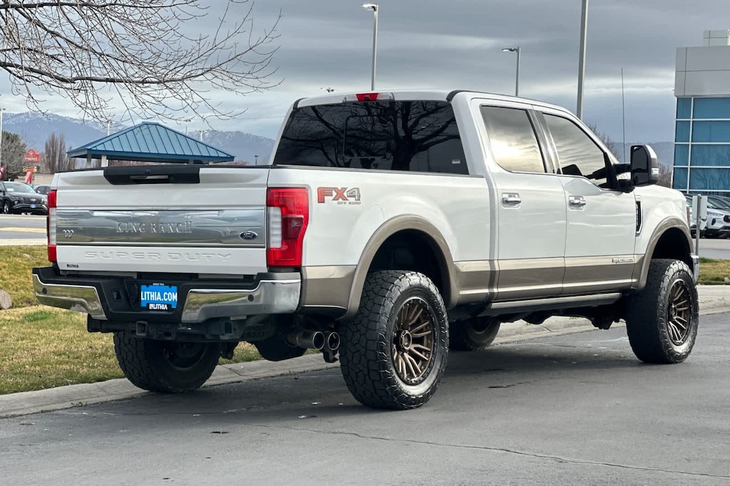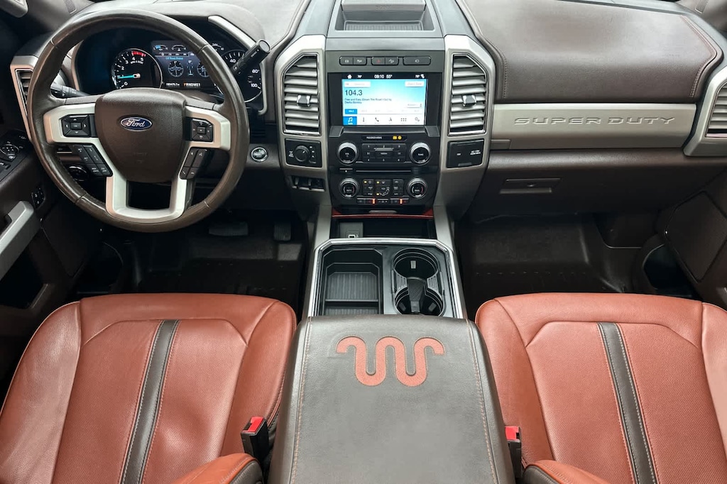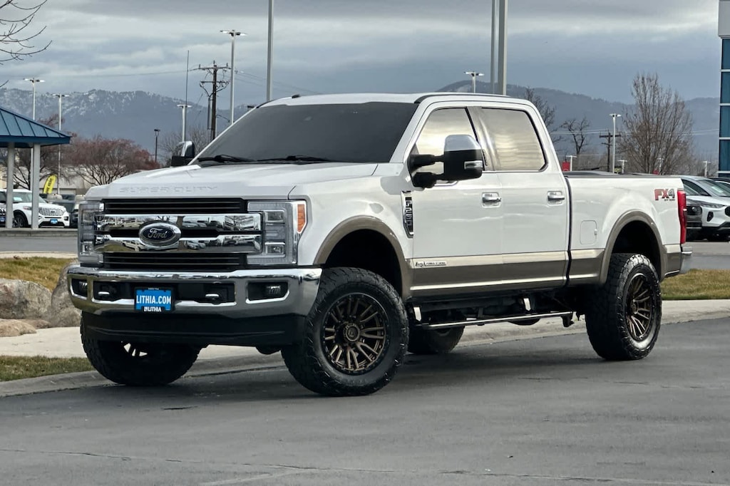 ENGINE: 6.7L 4V OHV POWER STROKE V8 TURBO DIESEL B20 manual push-button engine-exhaust braking and intelligent oil-life monitor, Extra Heavy-Duty 220 Amp Alternator, 34 Gallon Fuel Tank, 3.31 Axle Ratio, Dual 78-AH 750 CCA Batteries, KING RANCH ULTIMATE PACKAGE Twin Panel Power Moonroof, map lights and moonroof switches, Blind Spot Information System (BLIS), cross-traffic alert and trailer tow (BLIS sensor in taillamp), Tailgate Step & Handle, Quad Beam LED Headlamps & LED Taillamps, LED fog lamps and LED Center High-Mounted Stop Lamp (CHMSL), Power-Deployable Running Boards, Multi-Contour Seats, CHROME PACKAGE 2 front chrome tow hooks and chrome rear tailgate applique, Unique Chrome Mirror Caps, Chrome Front & Rear Bumpers, Wheels: 18 Chrome PVD Aluminum, light caribou wheel ornaments w/King Ranch logo, Body-Color Door Handles w/Chrome Insert, 6 Angular Chrome Step Bars, Chrome Exhaust Tip, ADAPTIVE CRUISE CONTROL & COLLISION WARNING brake support, ULTIMATE TRAILER TOW CAMERA SYSTEM 360 degree camera system and trailer reverse guidance, Display appears in center-stack screen, NOTE: Does not include customer placed trailer camera, Rear CHMSL Camera, Display in center stack screen, LED Center High-Mounted Stop Lamp (CHMSL) w/cargo light and rear video camera, TOUGH BED SPRAY-IN BEDLINER tailgate-guard, black box bed tie-down hooks, black bed attachment bolts and BoxLink mounting plates, ELECTRONIC-LOCKING W/3.55 AXLE RATIO, TRANSMISSION: TORQSHIFT 6-SPEED AUTOMATIC (6R140), SelectShift. 2018 Ford Super Duty F-250 Pickup with White Platinum Metallic Tri-Coat/Stone Gray exterior and Java interior features a 8 Cylinder Engine with 450 HP at 2800 RPM*.